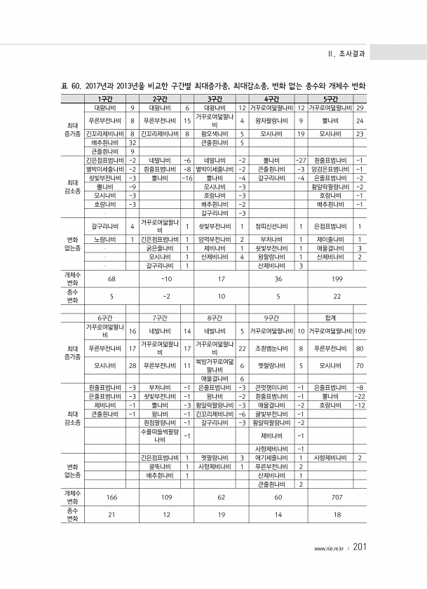 Ⅱ. 조사결과 www.nie.re.kr ? 201 표 60. 2017년과 2013년을 비교한 구간별 최대증가종, 최대감소종, 변화 없는 종수와 개체수 변화 1구간 2구간 3구간 4구간 5구간 최대 증가종 대왕나비 9 대왕나비 6 대왕나비 12 거꾸로여덟팔나비 12 거꾸로여덟팔나비 29 푸른부전나비 8 푸른부전나비 15 거꾸로여덟팔나 비 4 왕자팔랑나비 9 뿔나비 24 긴꼬리제비나비 8 긴꼬리제비나비 8 황오색나비 5 모시나비 19 모시나비 23 배추흰나비 32 큰줄흰나비 5 큰줄흰나비 9 최대 감소종 긴은점표범나비 -2 네발나비 -6 네발나비 -2 뿔나비 -27 흰줄표범나비 -1 별박이세줄나비 -2 흰줄표범나비 -8 별박이세줄나비 -2 큰줄흰나비 -3 암검은표범나비 -1 쇳빛부전나비 -3 뿔나비 -16 뿔나...
