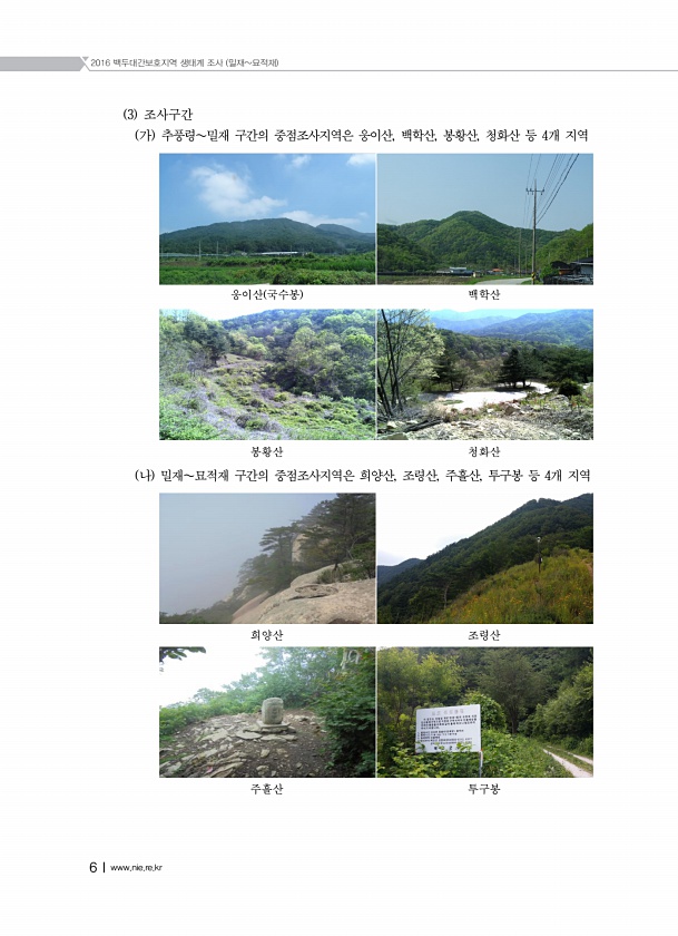 2016 백두대간보호지역 생태계 조사 밀재묘적재 6Ⅰwww.nie.re.kr 3 조사구간 가 추풍령∼밀재 구간의 중점조사지역은 웅이산, 백학산, 봉황산, 청화산 등 4개 지역 웅이산 국수봉 백학산 봉황산 청화산 나 밀재∼묘적재 구간의 중점조사지역은 희양산, 조령산, 주흘산, 투구봉 등 4개 지역 희양산 조령산 주흘산투구봉