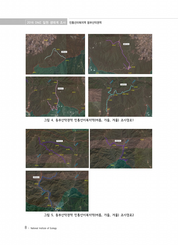 2016 DMZ 일원 생태계 조사 민통선이북지역 동부산악권역 8 ? National Institute of Ecology 그림 4. 동부산악권역 민통선이북지역 여름, 가을, 겨울 조사경로1 그림 5. 동부산악권역 민통선이북지역 여름, 가을, 겨울조사경로2