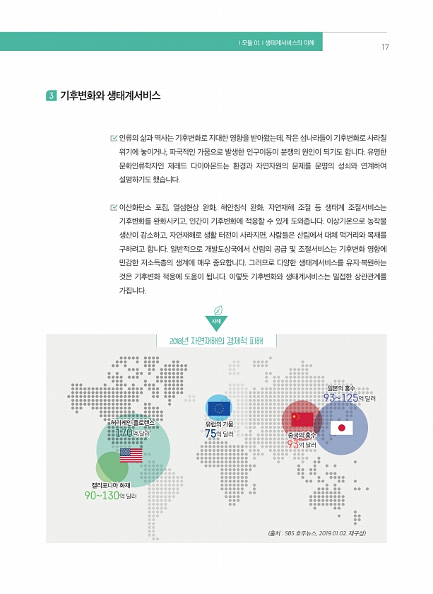Ⅰ모듈 01Ⅰ생태계서비스의 이해 17 2018년 자연재해의 경제적 피해 인류의 삶과 역사는 기후변화로 지대한 영향을 받아왔는데, 작은 섬나라들이 기후변화로 사라질 위기에 놓이거나, 파국적인 가뭄으로 발생한 인구이동이 분쟁의 원인이 되기도 합니다. 유명한 문화인류학자인 제레드 다이아몬드는 환경과 자연자원의 문제를 문명의 성쇠와 연계하여 설명하기도 했습니다. 이산화탄소 포집, 열섬현상 완화, 해안침식 완화, 자연재해 조절 등 생태계 조절서비스는 기후변화를 완화시키고, 인간이 기후변화에 적응할 수 있게 도와줍니다. 이상기온으로 농작물 생산이 감소하고, 자연재해로 생활 터전이 사라지면, 사람들은 산림에서 대체 먹거리와 목재를 구하려고 합니다. 일반적으로 개발도상국에서 산림의 공급 및 조절서비스는 기후변화 영향에 민...