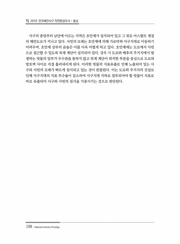 2018 전국해안사구 자연환경조사 충남 198 ? National Institute of Ecology 사구의 중앙부터 남단에 이르는 지역은 호안제가 설치되어 있고 그 위로 아스팔트 재질 의 해안도로가 지나고 있다. 사빈의 모래는 호안제에 의해 가로막혀 사구지대로 이동하기 어려우며, 호안제 상부의 곰솔은 이를 더욱 어렵게 하고 있다. 호안제에는 도로에서 사빈 으로 접근할 수 있도록 목제 계단이 설치되어 있다. 강우 시 도로와 배후의 주거지에서 발 생하는 빗물의 일부가 우수관을 통하지 않고 목제 계단이 위치한 부분을 중심으로 도로와 방호벽 사이로 직접 흘러내리게 된다. 이러한 빗물의 지표유출로 인해 노출되어 있는 사 구와 사빈의 모래가 빠르게 침식되고 있는 것이 관찰된다. 이는 도로와 주거지의 건설로 인해 사...