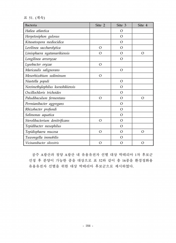 184 A A 1 52 16 Bacteria Site 2 Site 3 Site 4 Haliea atlantica O Herpetosiphon gulosus O Kitasatospora mediocidica O Levilinea saccharolytica O O Limisphaera ngatamarikiensis O O O Longilinea arvoryzae O Lysobacter oryzae O Maricaulis salignorans O Mesorhizobium sediminum O Niastella populi O Novimethylophilus kurashikiensis O Oscillochloris trichoides O Paludibaculum fermentans O O O Permianibact...