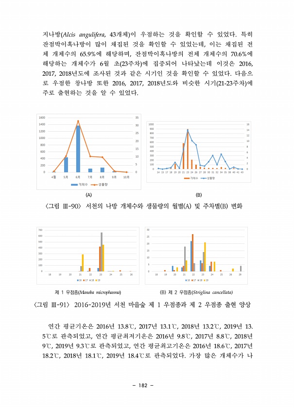 182 지나방 Alcis angulifera, 43개체 이 우점하는 것을 확인할 수 있었다. 특히 잔점박이혹나방이 많이 채집된 것을 확인할 수 있었는데, 이는 채집된 전 체 개체수의 65.9%에 해당하며, 잔점박이혹나방의 전체 개체수의 70.6%에 해당하는 개체수가 6월 초 23주차 에 집중되어 나타났는데 이것은 2016, 2017, 2018년도에 조사된 것과 같은 시기인 것을 확인할 수 있었다. 다음으 로 우점한 창나방 또한 2016, 2017, 2018년도와 비슷한 시기 21-23주차 에 주로 출현하는 것을 알 수 있었다. A B 그림 Ⅲ-90 서천의 나방 개체수와 생물량의 월별 A 및 주차별 B 변화 제 1 우점종 Manoba microphasma B 제 2 우점종 Striglina cancellata...