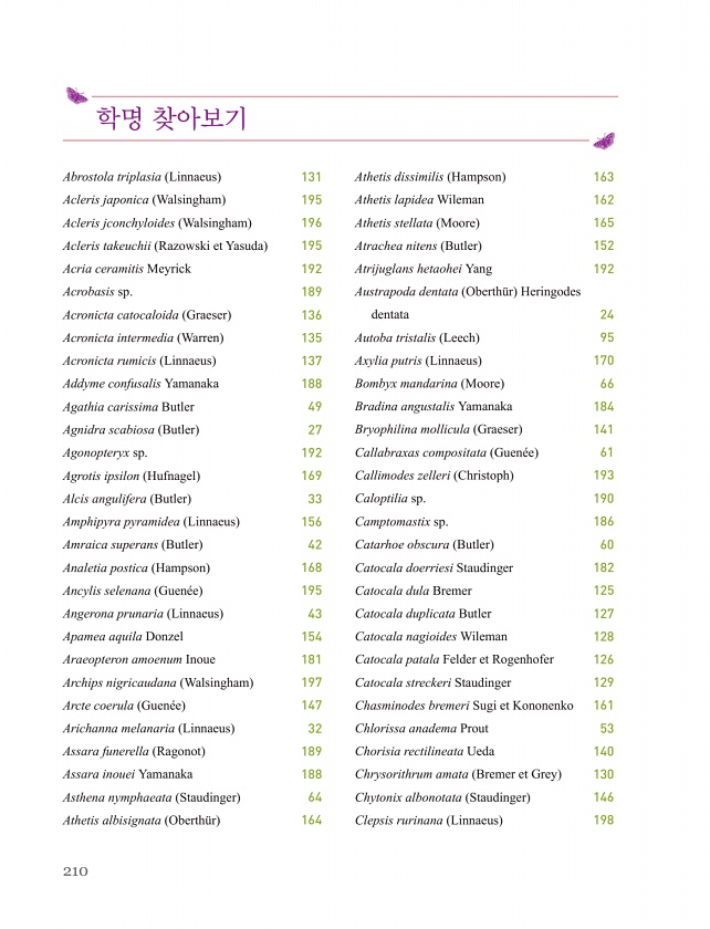 210 학명 찾아보기 Abrostola triplasia Linnaeus 131 Acleris japonica Walsingham 195 Acleris jconchyloides Walsingham 196 Acleris takeuchii Razowski et Yasuda 195 Acria ceramitis Meyrick 192 Acrobasis sp. 189 Acronicta catocaloida Graeser 136 Acronicta intermedia Warren 135 Acronicta rumicis Linnaeus 137 Addyme confusalis Yamanaka 188 Agathia carissima Butler 49 Agnidra scabiosa Butler 27 Agonopteryx sp. ...