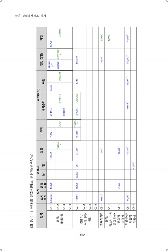 항목 도시 경작지 산림 초지 담수 습지 도시 연안 갯벌 해안 녹지 공공 시설 논 밭 내륙습지 하천 휴양/ 생태관광 C1-1 6,732,724*** 44,354** 119,532*** 940,741* ** 1,142* 24,731* 214,975* 2,103,113*** 82,525*** 2,060,309* 104,241,2 77*** 2,085,991* ** 32,753*** C1-2 378,425* 243,508** C1-3 500,590* C1-4 경관미/ 어메니티/ 영감 C2-1 18,104* 88,176* 50,827* 28* 341,097** 197,686* 158,85 1** 1,016,547* 1,894,799* 1,749* 683,340** C2-2 C2-3 C2-4 교육적가치 C3-1 60,...