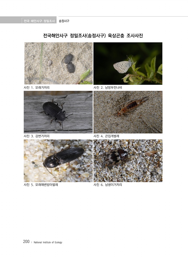 전국 해안사구 정밀조사 송정사구 200 ? National Institute of Ecology 전국해안사구 정밀조사 송정사구 육상곤충 조사사진 사진 1. 모래거저리 사진 2. 남방부전나비 사진 3. 강변거저리 사진 4. 큰집게벌레 사진 5. 모래해변방아벌레 사진 6.남생이거저리