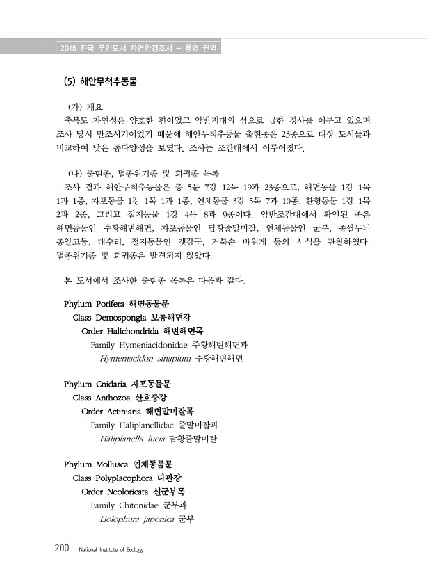 2015 전국 무인도서 자연환경조사 통영 권역 200 ? National Institute of Ecology 5 해안무척추동물 가 개요 충복도 자연성은 양호한 편이었고 암반지대의 섬으로 급한 경사를 이루고 있으며 조사 당시 만조시기이었기 때문에 해안무척추동물 출현종은 23종으로 대상 도서들과 비교하여 낮은 종다양성을 보였다. 조사는 조간대에서 이루어졌다. 나 출현종, 멸종위기종 및 희귀종 목록 조사 결과 해안무척추동물은 총 5문 7강 12목 19과 23종으로, 해면동물 1강 1목 1과 1종, 자포동물 1강 1목 1과 1종, 연체동물 3강 5목 7과 10종, 환형동물 1강 1목 2과 2종, 그리고 절지동물 1강 4목 8과 9종이다. 암반조간대에서 확인된 종은 해면동물인 주황해변해면, 자포동물인 담황줄말미잘,...