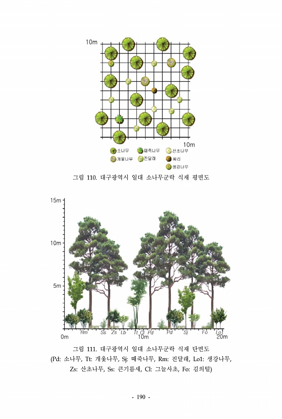 그림 110. 대구광역시 일대 소나무군락 식재 평면도 그림 111. 대구광역시 일대 소나무군락 식재 단면도 Pd소나무, Tt개옻나무, Sj때죽나무, Rm진달래, Lo1생강나무, Zs산초나무, Ss큰기름새, Cl그늘사초, Fo김의털 190