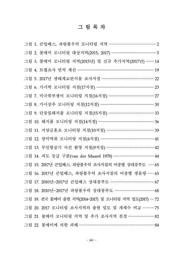 xiv 그 림 목 차 그림 1. 큰입배스, 파랑볼우럭 모니터링 지역 ··············································2 그림 2. 꽃매미 모니터링 대상지역 2015, 2017 ···········································5 그림 3. 꽃매미 모니터링 지역 2015년 및 신규 추가지역 2017년 ········14 그림 4. 트랩조사 면적 계산 ···········································································19 그림 5. 2017년 생태계교란식물 조사지점 ···················································22 그림 6. 가시박 모니터...