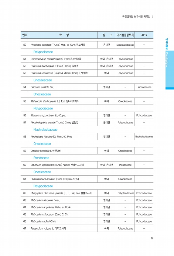 17 번호 학 명 장 소 국가생물종목록 APG 양치식물문 Pteridophyta 국립생태원 보유식물 목록집 Ⅰ 50 Hypolepis punctata Thunb. Mett. ex Kuhn 점고사리 온대관 Dennstaedtiaceae + Polypodiaceae 51 Lemmaphyllum microphyllum C. Presl 콩짜개덩굴 야외, 온대관 Polypodiaceae + 52 Lepisorus thunbergianus Kaulf. Ching 일엽초 야외, 온대관 Polypodiaceae + 53 Lepisorus ussuriensis Regel & Maack Ching 산일엽초 야외 Polypodiaceae + Lindsaeaceae 54 Lindsaea ensifolia Sw. 열대관 Linds...