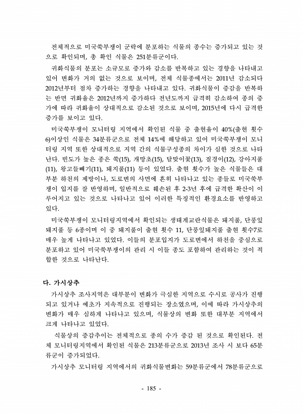 185 전체적으로 미국쑥부쟁이 군락에 분포하는 식물의 종수는 증가되고 있는 것 으로 확인되며, 총 확인 식물은 251분류군이다. 귀화식물의 분포는 소규모로 증가와 감소를 반복하고 있는 경향을 나타내고 있어 변화가 거의 없는 것으로 보이며, 전체 식물종에서는 2011년 감소되다 2012년부터 점차 증가하는 경향을 나타내고 있다. 귀화식물이 증감을 반복하 는 반면 귀화율은 2012년까지 증가하다 전년도까지 급격히 감소하여 종의 증 가에 따라 귀화율이 상대적으로 감소된 것으로 보이며, 2015년에 다시 급격한 증가를 보이고 있다. 미국쑥부쟁이 모니터링 지역에서 확인된 식물 중 출현율이 40% 출현 횟수 6 이상인 식물은 34분류군으로 전체 14%에 해당하고 있어 미국쑥부쟁이 모니 터링 지역 또한 상대적으로 지역 ...