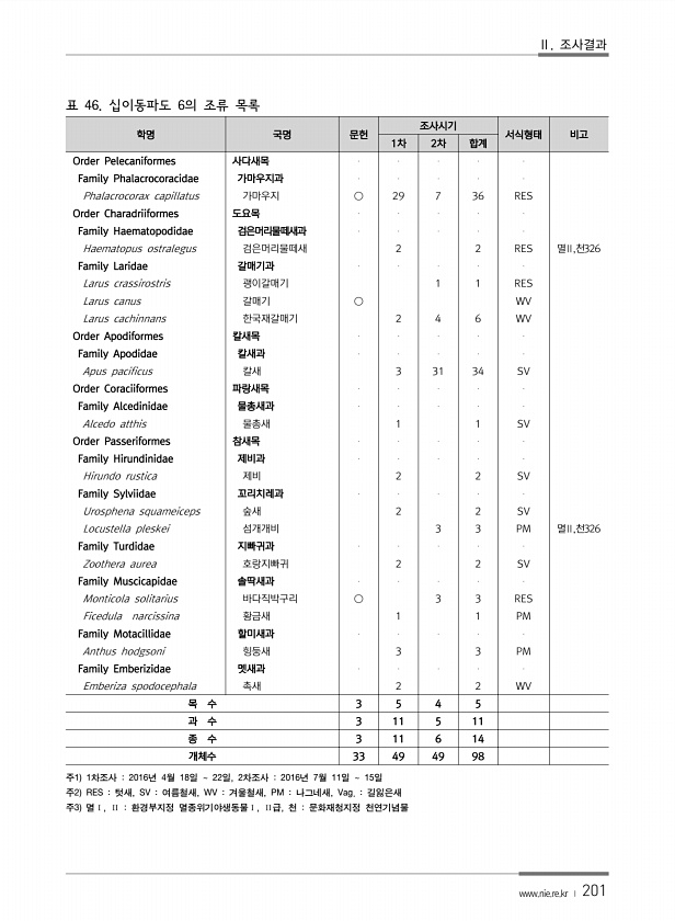 Ⅱ. 조사결과 www.nie.re.kr ? 201 표 46. 십이동파도 6의 조류 목록 학명 국명 문헌 조사시기 서식형태 비고 1차 2차 합계 Order Pelecaniformes 사다새목 Family Phalacrocoracidae 가마우지과 Phalacrocorax capillatus 가마우지 ○ 29 7 36 RES Order Charadriiformes 도요목 Family Haematopodidae 검은머리물떼새과 Haematopus ostralegus 검은머리물떼새 2 2 RES 멸Ⅱ,천326 Family Laridae 갈매기과 Larus crassirostris 괭이갈매기 1 1 RES Larus canus 갈매기 ○ WV Larus cachinnans 한국재갈매기 2 4 6 WV Order Ap...