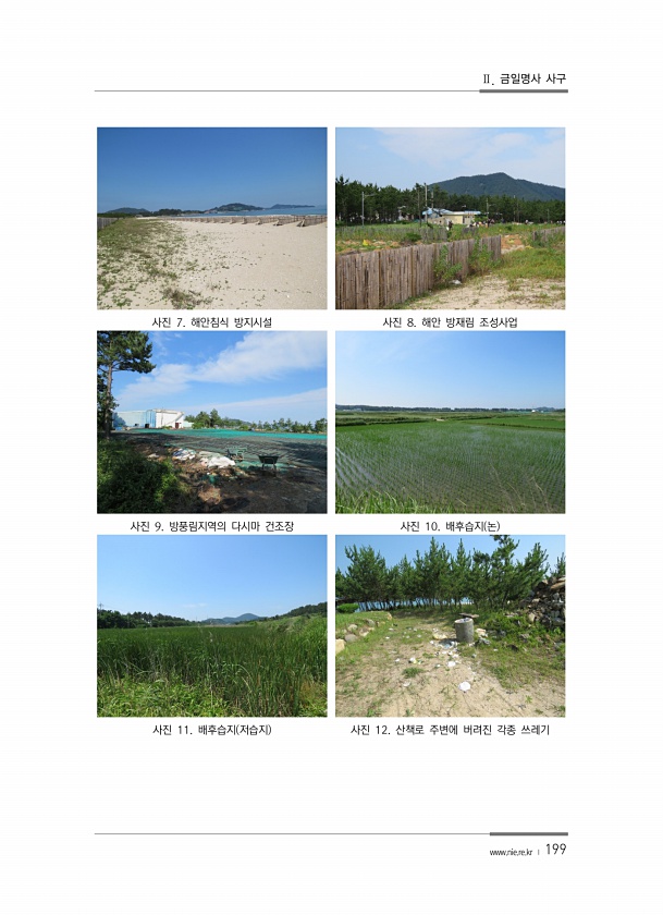Ⅱ. 금일명사 사구 www.nie.re.kr ? 199 사진 7. 해안침식 방지시설 사진 8. 해안 방재림 조성사업 사진 9. 방풍림지역의 다시마 건조장 사진 10. 배후습지 논 사진 11. 배후습지 저습지 사진 12. 산책로 주변에 버려진 각종쓰레기