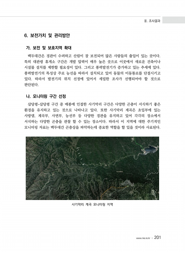 Ⅱ. 조사결과 www.nie.re.kr ? 201 6. 보전가치 및 관리방안 가. 보전 및 보호지역 확대 백두대간은 경관이 수려하고 산림이 잘 보전되어 많은 사람들의 출입이 있는 곳이다. 특히 대관령 휴게소 구간은 개발 압력이 매우 높은 곳으로 이곳에서 새로운 건축이나 시설물 설치를 제한할 필요성이 있다. 그리고 풍력발전기가 증가하고 있는 추세에 있다. 풍력발전기의 특성상 주로 능선을 따라서 설치되고 있어 동물의 이동통로를 단절시키고 있다. 따라서 발전기의 위치 선정에 있어서 세밀한 조사가 선행되어야 할 것으로 판단된다. 나. 모니터링 구간 선정 삽당령-삽당령 구간 중 매봉에 인접한 사기막리 구간은 다양한 곤충이 서식하기 좋은 환경을 유지하고 있는 것으로 나타나고 있다. 또한 사기막리 계곡은 초입부에 있는 ...