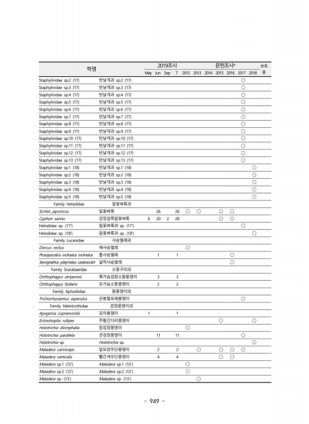 949 학명 2019조사 문헌조사* 보호 May Jun Sep T 2012 2013 2014 2015 2016 2017 2018 종 Staphylinidae sp.2 17 반날개과 sp.2 17 ? Staphylinidae sp.3 17 반날개과 sp.3 17 ? Staphylinidae sp.4 17 반날개과 sp.4 17 ? Staphylinidae sp.5 17 반날개과 sp.5 17 ? Staphylinidae sp.6 17 반날개과 sp.6 17 ? Staphylinidae sp.7 17 반날개과 sp.7 17 ? Staphylinidae sp.8 17 반날개과 sp.8 17 ? Staphylinidae sp.9 17 반날개과 sp.9 17 ? Staphylinidae sp.10 17 반날개과 sp...