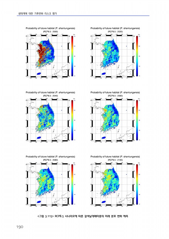 생태계에 대한 기후변화 리스크 평가 190 그림 3.115 RCP8.5 시나리오에 따른 갈색날개매미충의 미래 분포 변화예측