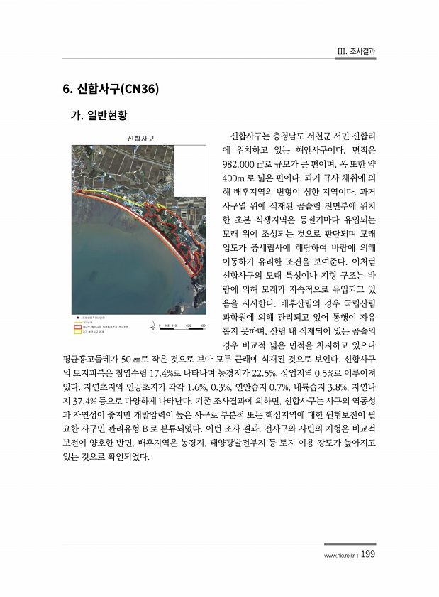 III. 조사결과 www.nie.re.kr ?199 6. CN36 신합사구는 충청남도 서천군 서면 신합리 에 위치하고 있는 해안사구이다. 면적은 982,000 ㎡로 규모가 큰 편이며, 폭 또한 약 400m 로 넓은 편이다. 과거 규사 채취에 의 해 배후지역의 변형이 심한 지역이다. 과거 사구열 위에 식재된 곰솔림 전면부에 위치 한 초본 식생지역은 동절기마다 유입되는 모래 위에 조성되는 것으로 판단되며 모래 입도가 중세립사에 해당하여 바람에 의해 이동하기 유리한 조건을 보여준다. 이처럼 신합사구의 모래 특성이나 지형 구조는 바 람에 의해 모래가 지속적으로 유입되고 있 음을 시사한다. 배후산림의 경우 국립산림 과학원에 의해 관리되고 있어 통행이 자유 롭지 못하며, 산림 내 식재되어 있는 곰솔의 경우 비교적 넓은...