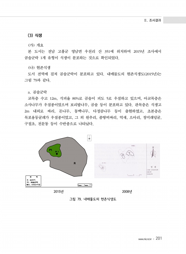Ⅱ. 조사결과 www.nie.re.kr ? 201 3 식생 가 개요 본 도서는 전남 고흥군 영남면 우천리 산 351에 위치하며 2015년 조사에서 곰솔군락 1개 유형이 식생이 분포하는 것으로 확인되었다. 나 현존식생 도서 전역에 걸쳐 곰솔군락이 분포하고 있다. 내매물도의 현존식생도 2015년 는 그림 79과 같다. a. 곰솔군락 교목층 수고 12m, 식피율 80%로 곰솔이 피도 5로 우점하고 있으며, 아교목층은 소사나무가 우점종이었으며 보리밥나무, 곰솔 등이 분포하고 있다. 관목층은 식생고 2m 내외로 싸리, 돈나무, 동백나무, 다정큼나무 등이 출현하였고, 초본층은 목포용둥굴레가 우점종이었고, 그 외 원추리, 좀땅비싸리, 억새, 으아리, 청미래덩굴, 구절초, 천문동 등이 수반종으로 나타났다. 2015년 20...