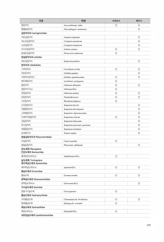 209 왕잠자리 Anax parthenope julius ○ ○ 황줄왕잠자리 Polycanthagyna melanictera ○ 실잠자리과 Coenagrionidae 작은실잠자리 Aciagrion migratum ○ 새노란실잠자리 Ceriagrion auranticum ○ 노란실잠자리 Ceriagrion melanurum ○ 아시아실잠자리 Ischnura asiatica ○ ○ 등검은실잠자리 Paracercion calamorum ○ 청실잠자리과 Lestidae 묵은실잠자리 Sympecma paedisca ○ 잠자리과 Libellulidae 고추잠자리 Crocothemis servilia ○ ○ 대모잠자리 Libellula angelina ○ 넉점박이잠자리 Libellula quadrimaculata ○ ○...