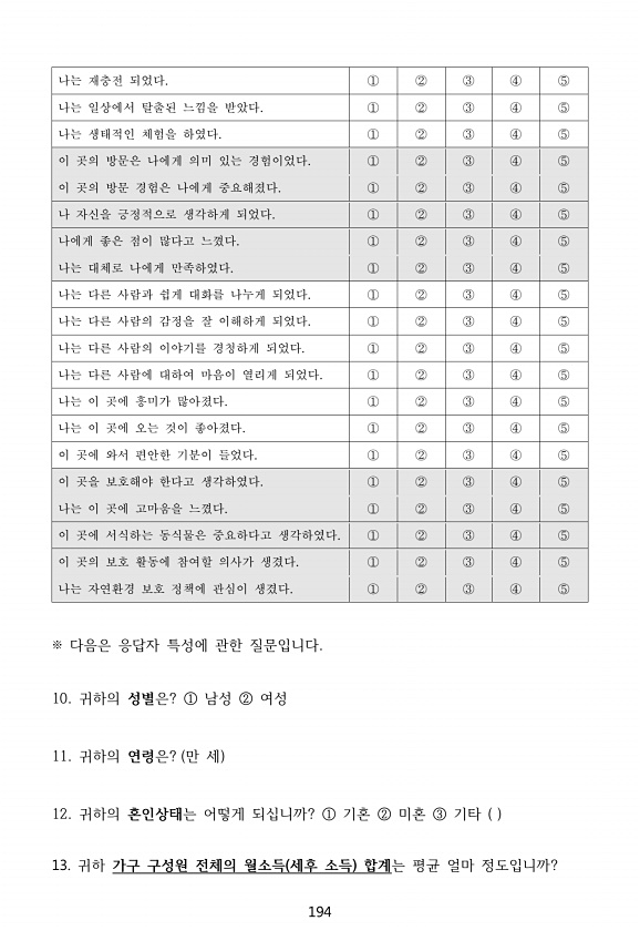 194 나는 재충전 되었다. ① ② ③ ④ ⑤ 나는 일상에서 탈출된 느낌을 받았다. ① ② ③ ④ ⑤ 나는 생태적인 체험을 하였다. ① ② ③ ④ ⑤ 이 곳의 방문은 나에게 의미 있는 경험이었다. ① ② ③ ④ ⑤ 이 곳의 방문 경험은 나에게 중요해졌다. ① ② ③ ④ ⑤ 나 자신을 긍정적으로 생각하게 되었다. ① ② ③ ④ ⑤ 나에게 좋은 점이 많다고 느꼈다. ① ② ③ ④ ⑤ 나는 대체로 나에게 만족하였다. ① ② ③ ④ ⑤ 나는 다른 사람과 쉽게 대화를 나누게 되었다. ① ② ③ ④ ⑤ 나는 다른 사람의 감정을 잘 이해하게 되었다. ① ② ③ ④ ⑤ 나는 다른 사람의 이야기를 경청하게 되었다. ① ② ③ ④ ⑤ 나는 다른 사람에 대하여 마음이 열리게 되었다. ① ② ③ ④ ⑤ 나는 이 곳에 흥미가 많아...