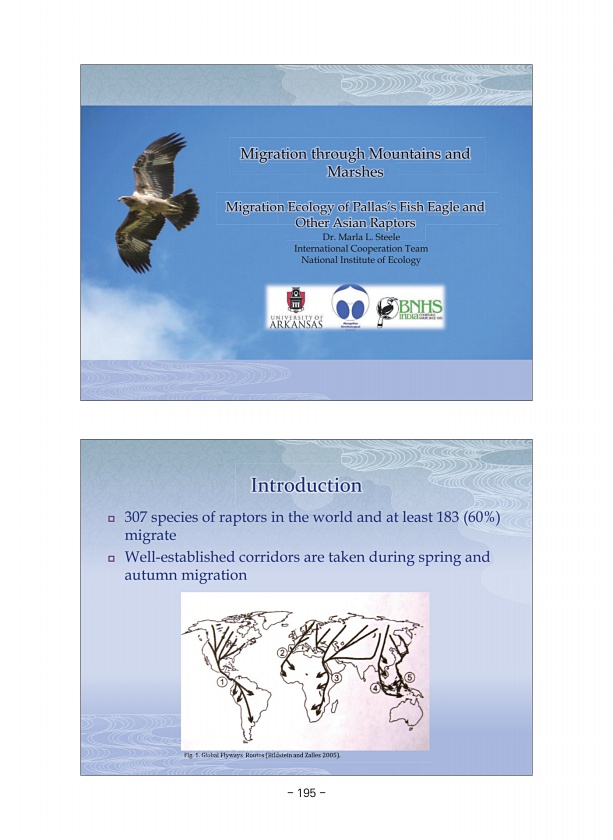 Introduction ? 307 species of raptors in the world and at least 183 60% migrate ? Well-established corridors are taken during spring and autumn migration Migration through Mountains and Marshes Migration Ecology of Pallas’s Fish Eagle and Other Asian Raptors Dr. Marla L. Steele International Cooperation Team National Institute of Ecology 195