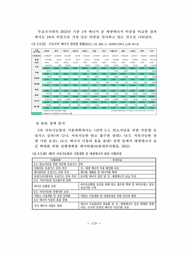 179 주요국가와의 2013년 기준 1차 에너지 중 재생에너지 비중을 비교한 결과 에서도 1%의 비중으로 가장 낮은 비중을 차지하고 있는 것으로 나타났다. 표 2-3-25 주요국의 에너지 생산량 현황 2013년 기준, 2016 신·재생에너지백서, p.740 재구성 4 관련 정책 분석 2차 지속가능발전 기본계획에서는 전략 2-1. 탄소저감을 위한 부문별 온 실가스 감축 과 2-3. 지속가능한 탄소 흡수원 증대 , 4-2. 지속가능한 경 제 기반 조성 , 4-3. 에너지 이용의 효율 증대 전략 등에서 재생에너지 보 급 확대를 위한 실행계획을 제시하였다 관계부처합동, 2011 이행과제 추진목표 2-1. 탄소저감을 위한 부문별 온실가스 감축 건물부문 온실가스 감축 추진 신·재생 에너지 이용 활성화 유도 폐기물부문 ...