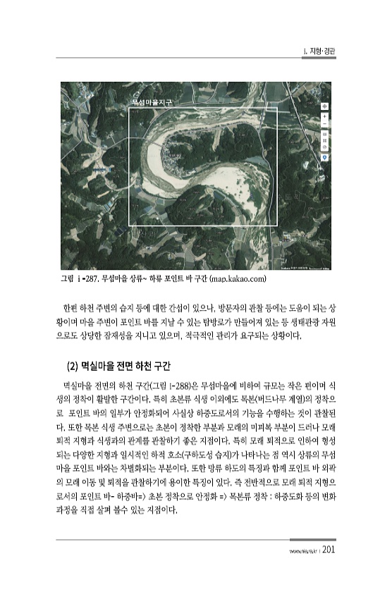 i. 지형·경관 www.nie.re.kr ?201 그림 ⅰ-287. 무섬마을 상류하류 포인트 바 구간 map.kakao.com 한편 하천 주변의 습지 등에 대한 간섭이 있으나, 방문자의 관찰 등에는 도움이 되는 상 황이며 마을 주변이 포인트 바를 지날 수 있는 탐방로가 만들어져 있는 등 생태관광 자원 으로도 상당한 잠재성을 지니고 있으며, 적극적인 관리가 요구되는 상황이다. 2 멱실마을 전면의 하천 구간 그림 i-288 은 무섬마을에 비하여 규모는 작은 편이며 식 생의 정착이 활발한 구간이다. 특히 초본류 식생 이외에도 목본 버드나무 계열 의 정착으 로 포인트 바의 일부가 안정화되어 사실상 하중도로서의 기능을 수행하는 것이 관찰된 다. 또한 목본 식생 주변으로는 초본이 정착한 부분과 모래의 미피복 부분이 드...