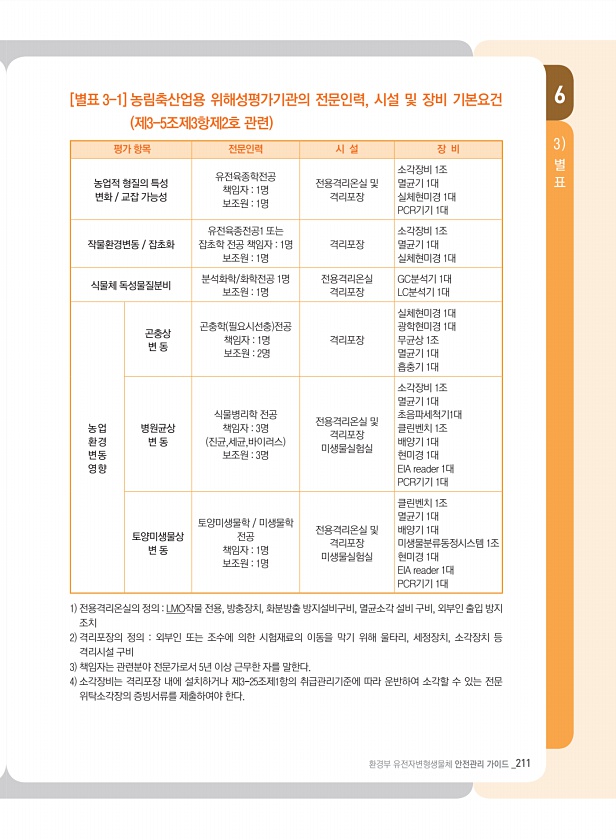 환경부 유전자변형생물체 안전관리 가이드 _211 6 별 표 3 [별표 3-1] 농림축산업용 위해성평가기관의 전문인력, 시설 및 장비 기본요건 제3-5조제3항제2호 관련 평가 항목 전문인력 시 설 장 비 농업적 형질의 특성 변화 교잡 가능성 유전육종학전공 책임자 1명 보조원 1명 전용격리온실 및 격리포장 소각장비 1조 멸균기 1대 실체현미경 1대 PCR기기 1대 작물환경변동 잡초화 유전육종전공1 또는 잡초학 전공 책임자 1명 보조원 1명 격리포장 소각장비 1조 멸균기 1대 실체현미경 1대 식물체 독성물질분비 분석화학/화학전공 1명 보조원 1명 전용격리온실 격리포장 GC분석기 1대 LC분석기 1대 농업 환경 변동 영향 곤충상 변 동 곤충학 필요시선충 전공 책임자 1명 보조원 2명 격리포장 실체현미경 1대 광학현...