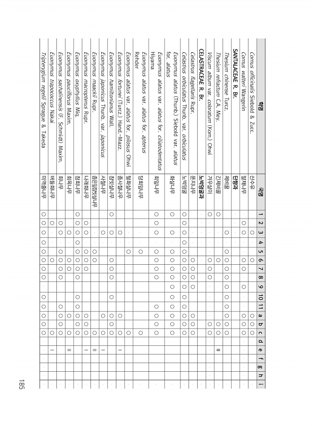185 학명 국명 1 2 3 4 5 6 7 8 9 10 11 a b c d e f g h i Cornus officinalis Siebold & Zucc. 산수유 ○ ○ ○ ○ ○ Cornus walteri Wangerin 말채나무 ○ ○ ○ ○ ○ ○ ○ ○ SANTALACEAE R. Br. 단향과 Thesium chinense Turcz. 제비꿀 ○ ○ ○ ○ ○ ○ ○ ○ ○ ○ ○ Thesium refractum C.A. Mey. 긴제비꿀 ○ ○ ○ ○ Ⅲ Viscum album var. coloratum Kom. Ohwi 겨우살이 ○ ○ ○ ○ ○ ○ CELASTRACEAE R. Br. 노박덩굴과 Celastrus flagellaris Rupr. 푼지나무 ○ ○ ○ ○ ○ ○ ○ Celastrus ...