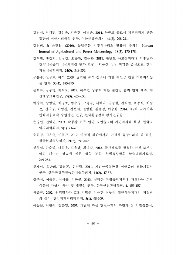 ? , , ? , , ? 2014. ? ? , 44 3 , 208-221. & , ? 2016 ? ? Korean Journal of Agricultural and Forest Meteorology, 18 3 , 170-178. ? ,? , ? , , ?2011. ? ? , 24 5 , 549-556. , , 2008. ? ? 30 4 , 485-495. , ? , 2017. , 29 3 , 627-635. , , , , , , ? , , , , , , , , ? , , 2014, 2 ? , · , 2003. ? , 9 1 , 66-76. , ? , .?2012. , 21 2 , 391-407. , , ? , ? ,? .?2013. , 249-253. , , ? , 2011. ? , 14 2 , 47-57....