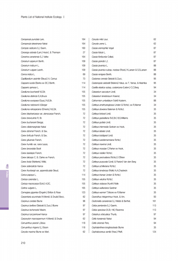 210 색인 Index Plants List of National Institute Ecology Ⅰ Campanula punctata Lam. 164 Campanula takesimana Nakai 164 Campsis radicans L. Seem. 160 Cananga odorata Lam. Hook.f. & Thomson 27 Canarina canariensis L. Vatke 164 Canarium asperum Benth. 109 Canarium indicum L. 109 Canarium vulgare Leenh. 109 Canna indica L. 69 Capillipedium assimile Steud. A. Camus 73 Capparis lucida Banks ex DC. Benth. 1...
