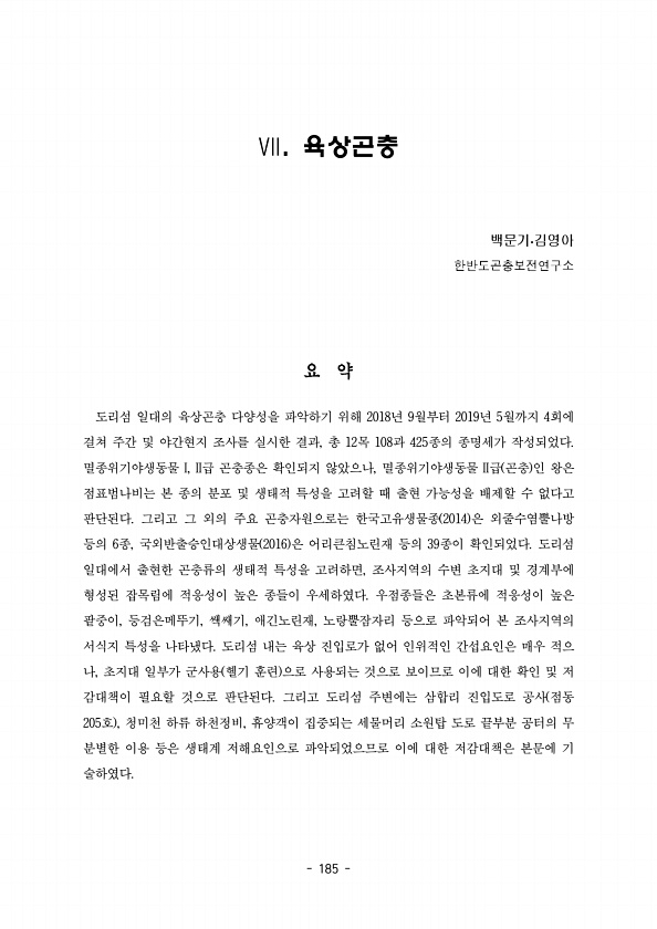 185 육상곤충.Ⅶ · 도리섬 일대의 육상곤충 다양성을 파악하기 위해 년 월부터 년 월까지 회에 2018 9 2019 5 4 걸쳐 주간 및 야간현지 조사를 실시한 결과 총 목 과 종의 종명세가 작성되었다 , 12 108 425 멸종위기야생동물 급 곤충종은 확인되지 않았으나 멸종위기야생동물 급 곤충 인 왕은 I, II , II 점표범나비는 본 종의 분포 및 생태적 특성을 고려할 때 출현 가능성을 배제할 수 없다고 판단된다 그리고 그 외의 주요 곤충자원으로는 한국고유생물종 은 외줄수염뿔나방 2014 등의 종 국외반출승인대상생물 은 어리큰침노린재 등의 종이 확인되었다 도리섬 6 , 2016 39 일대에서 출현한 곤충류의 생태적 특성을 고려하면 조사지역의 수변 초지대 및 경계부에 , 형성된 잡목림에 적응성이 높은 ...