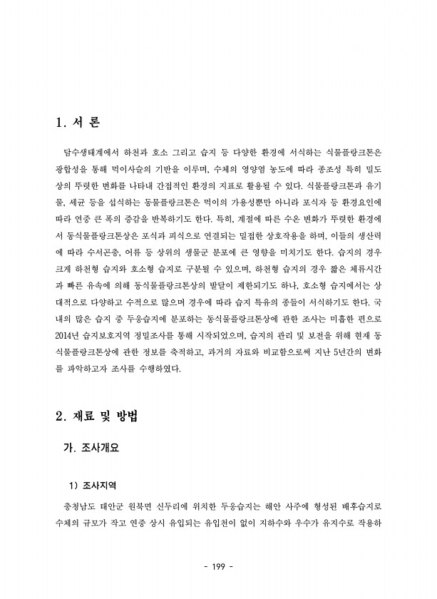 199 1. 서 론 담수생태계에서 하천과 호소 그리고 습지 등 다양한 환경에 서식하는 식물플랑크톤은 광합성을 통해 먹이사슬의 기반을 이루며, 수체의 영양염 농도에 따라 종조성 특히 밀도 상의 뚜렷한 변화를 나타내 간접적인 환경의 지표로 활용될 수 있다. 식물플랑크톤과 유기 물, 세균 등을 섭식하는 동물플랑크톤은 먹이의 가용성뿐만 아니라 포식자 등 환경요인에 따라 연중 큰 폭의 증감을 반복하기도 한다. 특히, 계절에 따른 수온 변화가 뚜렷한 환경에 서 동식물플랑크톤상은 포식과 피식으로 연결되는 밀접한 상호작용을 하며, 이들의 생산력 에 따라 수서곤충, 어류 등 상위의 생물군 분포에 큰 영향을 미치기도 한다. 습지의 경우 크게 하천형 습지와 호소형 습지로 구분될 수 있으며, 하천형 습지의 경우 짧은 체류시간 과...