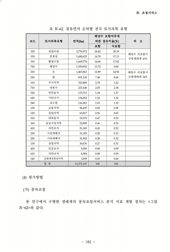 Ⅳ. 조절서비스 183 코드 토지피복유형 면적 ha 해양수 포함여부에 따른 점유비율 % 비 고 포함 미포함 320 침엽수림 2,776,972 24.42 28.30 해양수 미포함시 330 혼효림 1,680,625 14.78 17.13 산림생태계 63% 310 활엽수림 1,669,770 14.68 17.02 720 해양수 1,559,952 13.72 0.00 210 논 1,465,863 12.89 14.94 해양수 미포함시 220 밭 851,120 7.48 8.68 논밭생태계 24% 110 주거지역 315,889 2.78 3.22 710 내륙수 233,148 2.05 2.38 520 연안습지 133,715 1.18 1.37 620 기타나지 134,002 1.18 1.36 240 과수원 116,963 1.03 1...