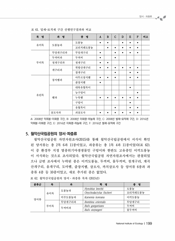 양서ㆍ파충류 National Institute of EcologyⅠ199 분류군 목 과 학 명 종 명 양서류 유미목 도롱뇽과 Hynobius leechii 도롱뇽 Onychodactylus fischeri 꼬리치레도롱뇽 미주도롱뇽과 Karsenia koreana 이끼도롱뇽 무미목 무당개구리과 Bombina orientalis 무당개구리 두꺼비과 Bufo gargarizans 두꺼비 Bufo stejnegeri 물두꺼비 표 62. 월악산국립공원의 양서·파충류 목록 2015년 목 명 과 명 종 명 A B C D E F 비고 유미목 도롱뇽과 도롱뇽 ? ? ? ? ? 꼬리치레도롱뇽 ? ? ? ? ? 무미목 무당개구리과 무당개구리 ? ? ? ? ? 두꺼비과 두꺼비 ? ? 청개구리과 청개구리 ? ? 개구리과 북방산개구...