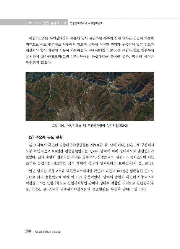 2017 DMZ 일원 생태계 조사 민통선이북지역 서부평야권역 200 ? National Institute of Ecology 이길리코스는 무인생태장비 운용에 있어 유일하게 북쪽의 산림 내부로 접근이 가능한 지역으로 주로 활엽수로 이루어져 있으며 군부대 시설인 진지가 구축되어 있고 임도가 개설되어 있어 차량에 이동이 가능하였다. 무인생태장비 SM-6은 산림과 임도 임연부에 설치하여 조사하였으며 그림 107 녹음된 음성파일을 분석한 결과, 박쥐의 서식은 확인되지 않았다. 그림 107. 이길리코스 내 무인생태장비 설치지점 SM-3 2 주요종 분포 현황 본 조사에서 확인된 멸종위기야생생물은 2종 Ⅱ급 삵, 담비 이다. 삵은 8개 구간에서 모두 확인되었고 100일간 평균출현빈도는 1.58로 담비에 비해 상대적으로 출...