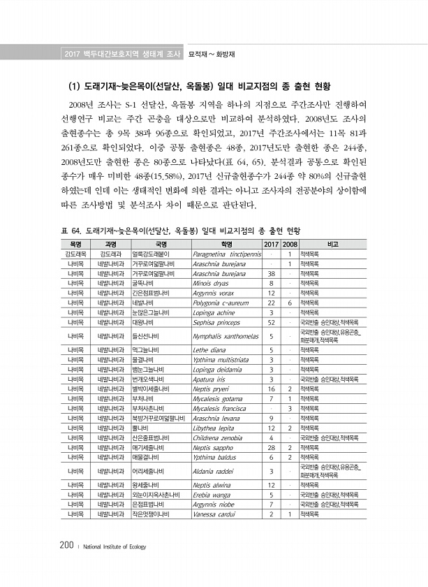 2017 백두대간보호지역 생태계 조사 묘적재 화방재 200 ? National Institute of Ecology 목명 과명 국명 학명 2017 2008 비고 강도래목 강도래과 얼룩강도래붙이 Paragnetina tinctipennis 1 적색목록 나비목 네발나비과 거꾸로여덟팔나비 Araschnia burejana 1 적색목록 나비목 네발나비과 거꾸로여덟팔나비 Araschnia burejana 38 적색목록 나비목 네발나비과 굴뚝나비 Minois dryas 8 적색목록 나비목 네발나비과 긴은점표범나비 Argynnis vorax 12 적색목록 나비목 네발나비과 네발나비 Polygonia c-aureum 22 6 적색목록 나비목 네발나비과 눈많은그늘나비 Lopinga achine 3 적색...