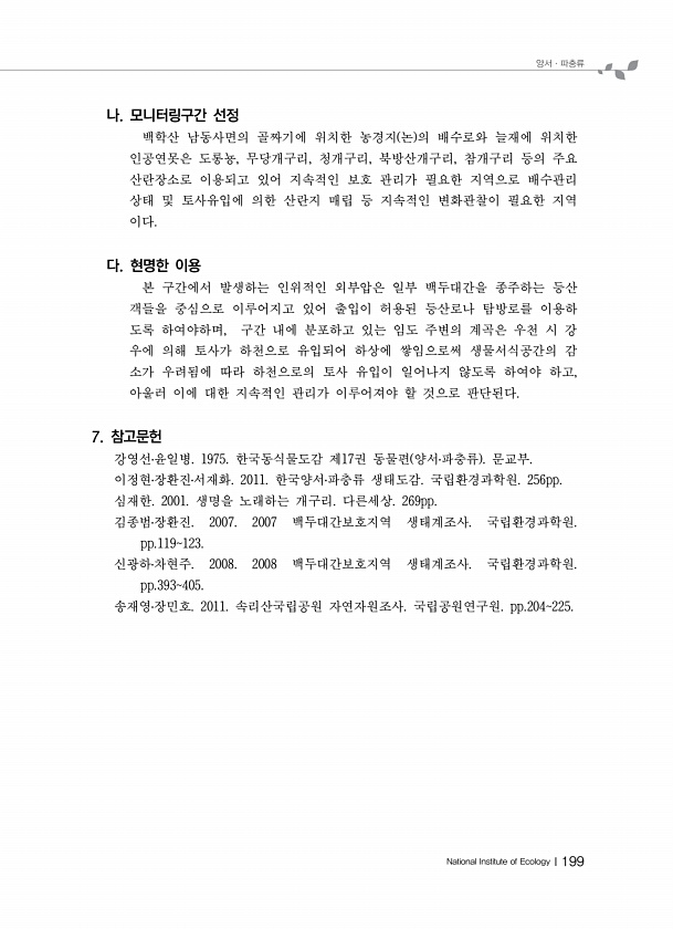 양서ㆍ파충류 National Institute of EcologyⅠ199 나. 모니터링구간 선정 백학산 남동사면의 골짜기에 위치한 농경지 논 의 배수로와 늘재에 위치한 인공연못은 도롱뇽, 무당개구리, 청개구리, 북방산개구리, 참개구리 등의 주요 산란장소로 이용되고 있어 지속적인 보호 관리가 필요한 지역으로 배수관리 상태 및 토사유입에 의한 산란지 매립 등 지속적인 변화관찰이 필요한 지역 이다. 다. 현명한 이용 본 구간에서 발생하는 인위적인 외부압은 일부 백두대간을 종주하는 등산 객들을 중심으로 이루어지고 있어 출입이 허용된 등산로나 탐방로를 이용하 도록 하여야하며, 구간 내에 분포하고 있는 임도 주변의 계곡은 우천 시 강 우에 의해 토사가 하천으로 유입되어 하상에 쌓임으로써 생물서식공간의 감 소가 우려됨에...