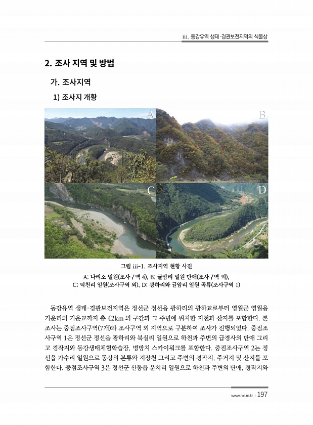iii. 동강유역 생태·경관보전지역의 식물상 www.nie.re.kr ?197 2. 1 그림 iii-1. 조사지역 현황 사진 A; 나리소 일원 조사구역 4 , B; 귤암리 일원 단애 조사구역 외 , C; 덕천리 일원 조사구역 외 , D; 광하리와 귤암리 일원 곡류 조사구역 1 동강유역 생태·경관보전지역은 정선군 정선읍 광하리의 광하교로부터 영월군 영월읍 거운리의 거운교까지 총 42km 의 구간과 그 주변에 위치한 지천과 산지를 포함한다. 본 조사는 중점조사구역 7개 와 조사구역 외 지역으로 구분하여 조사가 진행되었다. 중점조 사구역 1은 정선군 정선읍 광하리와 북실리 일원으로 하천과 주변의 급경사의 단애 그리 고 경작지와 동강생태체험학습장, 병방치 스카이워크를 포함한다. 중점조사구역 2는 정 선읍 가수리 일...