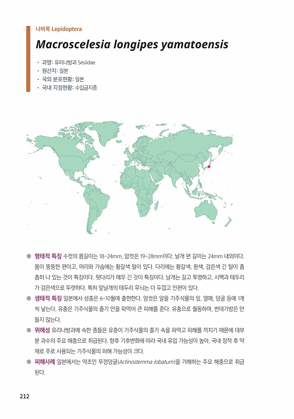 212 ● 형태적 특징 수컷의 몸길이는 18-24mm, 암컷은 19-28mm이다. 날개 편 길이는 24mm 내외이다. 몸이 뚱뚱한 편이고, 머리와 가슴에는 황갈색 털이 있다. 다리에는 황갈색, 흰색, 검은색 긴 털이 촘 촘히 나 있는 것이 특징이다. 뒷다리가 매우 긴 것이 특징이다. 날개는 길고 투명하고, 시맥과 테두리 가 검은색으로 뚜렷하다. 특히 앞날개의 테두리 무늬는 더 두껍고 인편이 있다. ● 생태적 특징 일본에서 성충은 6-10월에 출현한다. 암컷은 알을 기주식물의 잎, 열매, 덩굴 등에 1개 씩 낳는다. 유충은 기주식물의 줄기 안을 파먹어 큰 피해를 준다. 유충으로 월동하며, 번데기방은 만 들지 않는다. ● 위해성 유리나방과에 속한 종들은 유충이 기주식물의 줄기 속을 파먹고 피해를 끼치기 때문에 ...