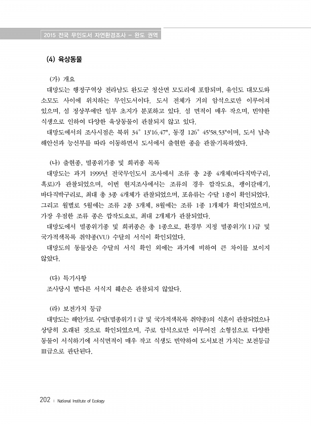 2015 전국 무인도서 자연환경조사 완도 권역 202 ? National Institute of Ecology 4 육상동물 가 개요 대망도는 행정구역상 전라남도 완도군 청산면 모도리에 포함되며, 유인도 대모도와 소모도 사이에 위치하는 무인도서이다. 도서 전체가 거의 암석으로만 이루어져 있으며, 섬 정상부에만 일부 초지가 분포하고 있다. 섬 면적이 매우 작으며, 빈약한 식생으로 인하여 다양한 육상동물이 관찰되지 않고 있다. 대망도에서의 조사시점은 북위 34°1316.47, 동경 126°4558.53이며, 도서 남측 해안선과 능선부를 따라 이동하면서 도서에서 출현한 종을 관찰?기록하였다. 나 출현종, 멸종위기종 및 희귀종 목록 대망도는 과거 1999년 전국무인도서 조사에서 조류 총 2종 4개체 바다직박구리, 흑...