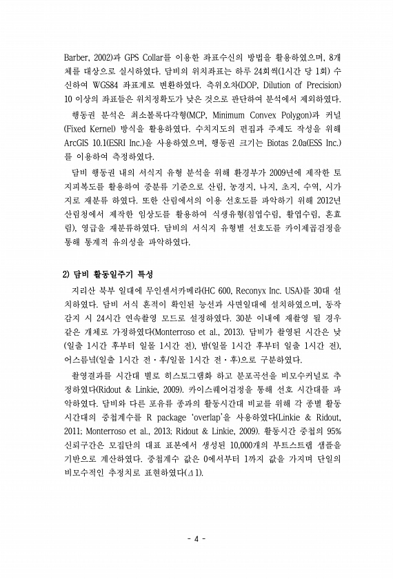 4 Barber, 2002 과 GPS Collar를 이용한 좌표수신의 방법을 활용하였으며, 8개 체를 대상으로 실시하였다. 담비의 위치좌표는 하루 24회씩 1시간 당 1회 수 신하여 WGS84 좌표계로 변환하였다. 측위오차 DOP, Dilution of Precision 10 이상의 좌표들은 위치정확도가 낮은 것으로 판단하여 분석에서 제외하였다. 행동권 분석은 최소볼록다각형 MCP, Minimum Convex Polygon 과 커널 Fixed Kernel 방식을 활용하였다. 수치지도의 편집과 주제도 작성을 위해 ArcGIS 10.1 ESRI Inc. 을 사용하였으며, 행동권 크기는 Biotas 2.0a ESS Inc. 를 이용하여 측정하였다. 담비 행동권 내의 서식지 유형 분석을 위해 환경부가 2009년에 ...