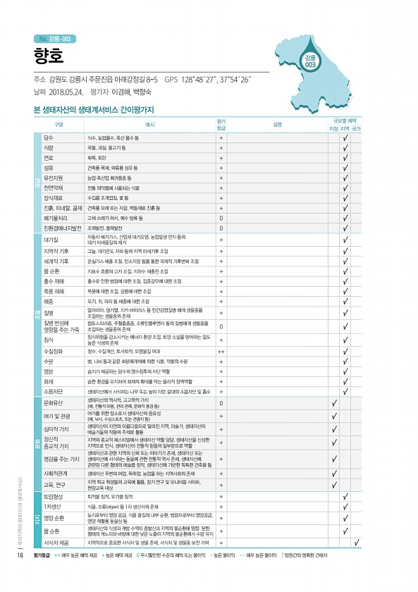 No. 강릉- 강릉 003 본 생태자산의 생태계서비스 간이평가지 구분 예시 평가 등급 설명 규모별 혜택 지점 지역 국가 공급 담수 식수, 농업용수, 축산 용수 등 + √ 식량 곡물, 과실, 물고기 등 + √ 연료 화목, 토탄 + √ 섬유 건축용 목재, 의류용 섬유 등 + √ 유전자원 농업·축산업 희귀품종 등 + √ 천연약재 전통 의약품에 사용되는 식물 + √ 장식재료 수집용 조개껍질, 꽃 등 + √ 진흙, 미네랄, 골재 건축용 모래 또는 자갈, 벽돌재료 진흙 등 + √ 폐기물처리 고체 쓰레기 하치, 폐수 방류 등 0 √ 친환경에너지발전 조력발전, 풍력발전 0 √ 조절 대기질 자동차 배기가스, 산업체 대기오염, 농업발생 먼지 등의 대기 미세물질의 제거 + √ 지역적 기후 그늘, 대기온도 저하 등의 지역 미세기...