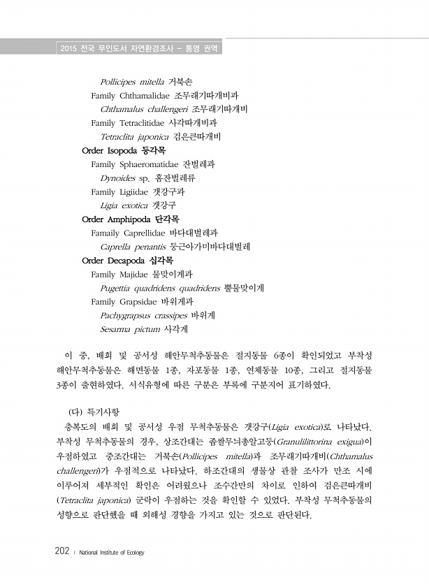 2015 전국 무인도서 자연환경조사 통영 권역 202 ? National Institute of Ecology Pollicipes mitella 거북손 Family Chthamalidae 조무래기따개비과 Chthamalus challengeri 조무래기따개비 Family Tetraclitidae 사각따개비과 Tetraclita japonica 검은큰따개비 Order Isopoda 등각목 Family Sphaeromatidae 잔벌레과 Dynoides sp. 홈잔벌레류 Family Ligiidae 갯강구과 Ligia exotica 갯강구 Order Amphipoda 단각목 Famaily Caprellidae 바다대벌레과 Caprella penantis 둥근아가미바다대벌레 Order Decapoda 십각목 Fa...
