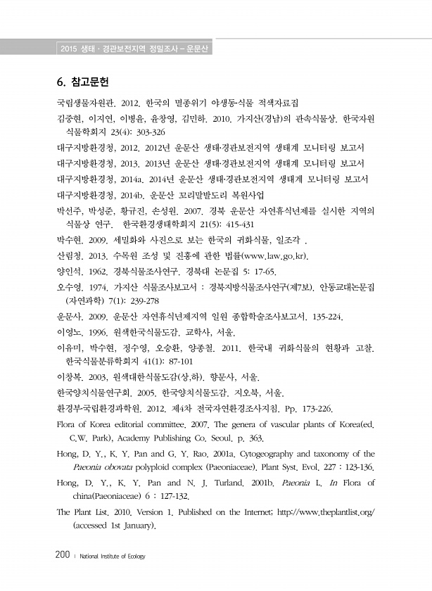 2015 생태·경관보전지역 정밀조사 운문산 200 ? National Institute of Ecology 6. 참고문헌 국립생물자원관. 2012. 한국의 멸종위기 야생동?식물 적색자료집 김중현, 이지연, 이병윤, 윤창영, 김민하. 2010. 가지산 경남 의 관속식물상. 한국자원 식물학회지 23 4 303-326 대구지방환경청, 2012. 2012년 운문산 생태?경관보전지역 생태계 모니터링 보고서 대구지방환경청, 2013. 2013년 운문산 생태?경관보전지역 생태계 모니터링 보고서 대구지방환경청, 2014a. 2014년 운문산 생태?경관보전지역 생태계 모니터링 보고서 대구지방환경청, 2014b. 운문산 꼬리말발도리 복원사업 박선주, 박성준, 황규진, 손성원. 2007. 경북 운문산 자연휴식년제를 실시한 지역...