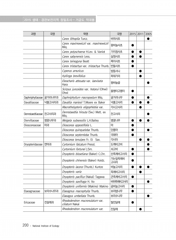2015 생태·경관보전지역 정밀조사 거금도 적대봉 200 ? National Institute of Ecology 과명 국명 학명 국명 2015 2011 `2005 Carex lithopila Turcz. 바위사초 ● Carex maximowiczii var. maximowiczii Miq. 왕비늘사초 ● Carex polyschoena H.Lev. & Vaniot 가지청사초 ● ● Carex sabynensis Less. 실청사초 ● ● Carex teinogyna Boott 폭이사초 ● Carex tristachya var. tristachya Thunb. 반들사초 ● Cyperus amuricus 방동사니 ● Kyllinga brevifolius 파대가리 ● Eleocharis atteuata var....