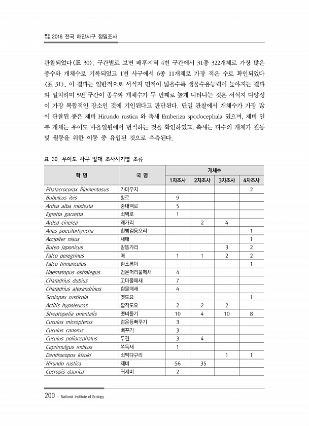 2016 전국 해안사구 정밀조사 200 ? National Institute of Ecology 학 명 국 명 개체수 1차조사 2차조사 3차조사 4차조사 Phalacrocorax filamentosus 가마우지 2 Bubulcus ibis 황로 9 Ardea alba modesta 중대백로 5 Egretta garzetta 쇠백로 1 Ardea cinerea 왜가리 2 4 Anas poecilorhyncha 흰뺨검둥오리 1 Accipiter nisus 새매 1 Buteo japonicus 말똥가리 3 2 Falco peregrinus 매 1 1 2 2 Falco tinnunculus 황조롱이 1 Haematopus ostralegus 검은머리물떼새 4 Charadrius dubius 꼬마물떼새 7 Chara...