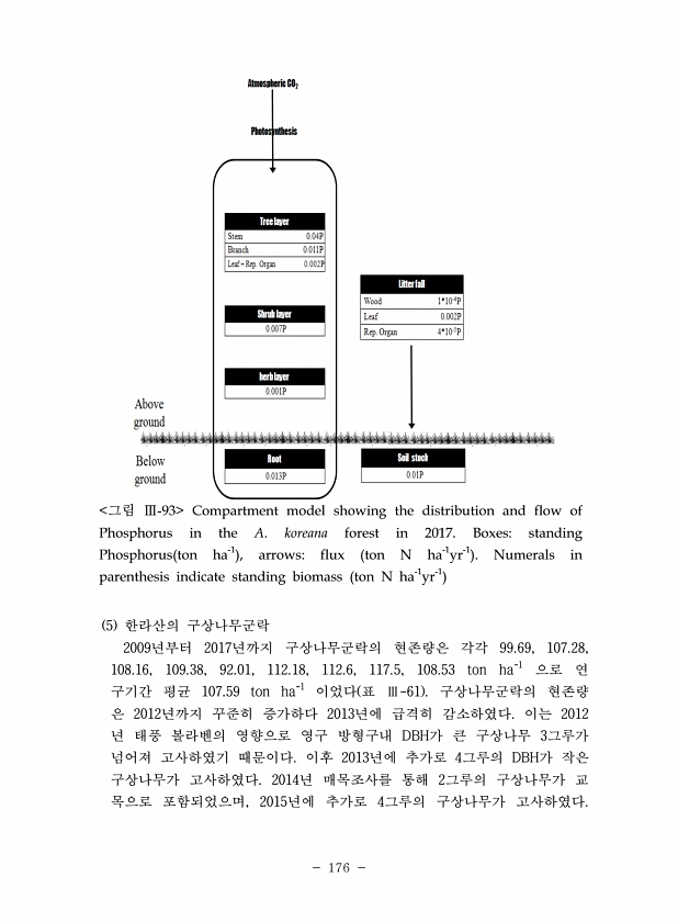 176 그림 Ⅲ-93 Compartment model showing the distribution and flow of Phosphorus in the A. koreana forest in 2017. Boxesstanding Phosphorus ton ha-1 , arrowsflux ton N ha-1yr-1 Numerals in parenthesis indicate standing biomass ton N ha-1yr-1 5 한라산의 구상나무군락 2009년부터 2017년까지 구상나무군락의 현존량은 각각 99.69, 107.28, 108.16, 109.38, 92.01, 112.18, 112.6, 117.5, 108.53 ton ha-1 으로 연 구기간 평균 107.59 ton ha-1 이었다 표 Ⅲ-61 ...