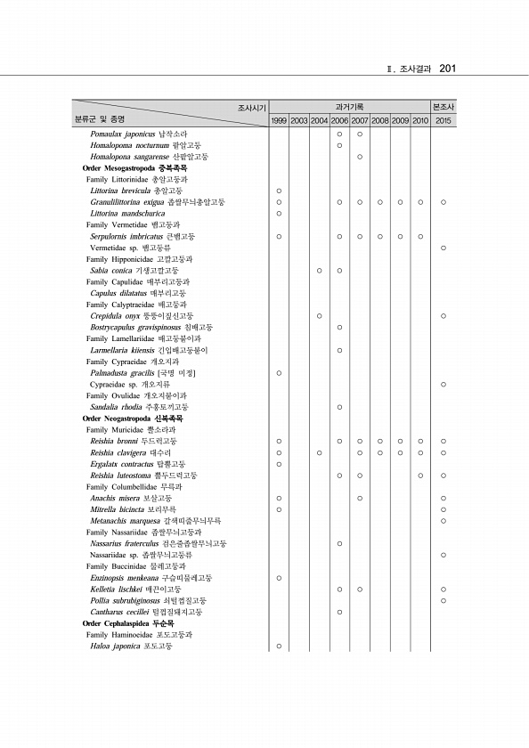 Ⅱ. 조사결과 201 조사시기 분류군 및 종명 과거기록 본조사 1999 2003 2004 2006 2007 2008 2009 2010 2015 Pomaulax japonicus 납작소라 ○ ○ Homalopoma nocturnum 팥알고둥 ○ Homalopona sangarense 산팥알고둥 ○ Order Mesogastropoda 중복족목 Family Littorinidae 총알고둥과 Littorina brevicula 총알고둥 ○ Granulilittorina exigua 좁쌀무늬총알고둥 ○ ○ ○ ○ ○ ○ ○ Littorina mandschurica ○ Family Vermetidae 뱀고둥과 Serpulornis imbricatus 큰뱀고둥 ○ ○ ○ ○ ○ ○ Vermetidae sp. 뱀고둥류 ...