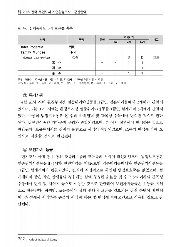 2016 전국 무인도서 자연환경조사 군산권역 202 ? National Institute of Ecology 표 47. 십이동파도 6의 포유류 목록 학명 국명 문헌 조사시기 비고 1차 2차 합계 Order Rodentia 쥐목 Family Muridae 쥐과 Rattus norvegicus 집쥐 D D 유입종 목 수 1 1 과 수 1 1 종 수 1 1 주1 1차조사 2016년 4월 18일 22일, 2차조사 2016년 7월 11일 15일 주2 D 분변, F 족적, V 목견, T 터널, E 섭식흔적, K 사체, S 소리, Y 새끼 ③ 특기사항 4월 조사 시에 환경부지정 멸종위기야생동물Ⅱ급인 검은머리물떼새 2개체가 관찰되 었으며, 7월 조사 시에는 환경부지정 멸종위기야생동물Ⅱ급인 섬개개비 3개체가 관찰되 었다. ...